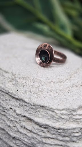 This handcrafted copper ring features a vibrant green cubic zirconia (CZ) stone, expertly set to catch the light and add a touch of elegance. The Size 6 ring is carefully handmade, giving each piece a unique, artisanal charm. Lightweight yet durable, it’s perfect for everyday wear or as a thoughtful gift. Add a pop of color and sophistication to any outfit with this striking handmade copper ring.