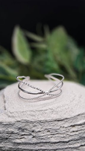 Delicately crafted, this handmade sterling silver crossover cuff bracelet fits wrist sizes 5–7 inches, offering a stylish and timeless accessory for any occasion.