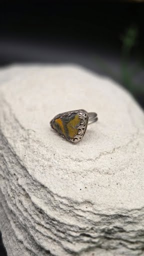 A beautiful Bumblebee Jasper ring, size 5½, designed to make a statement with its vivid patterns and natural beauty.