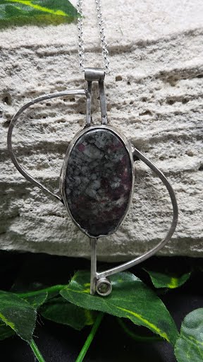 Handmade sterling silver pendant featuring a striking eudialyte gemstone on a 26-inch sterling silver chain.