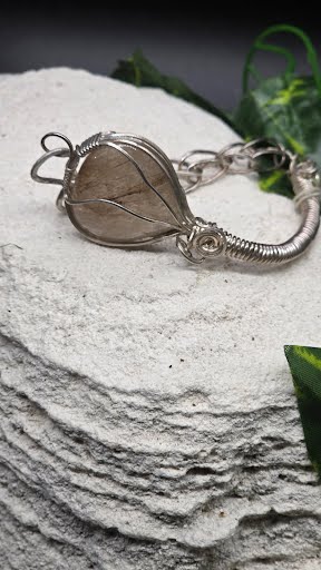 This sterling silver bracelet showcases a natural Rutile Quartz stone, known for its golden needle-like inclusions and unique beauty.