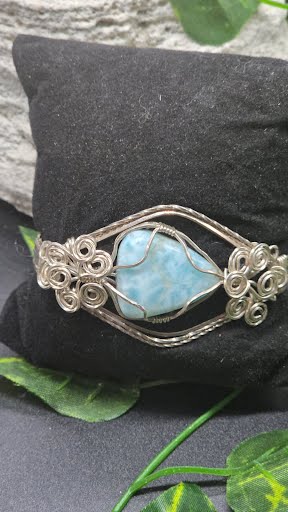 This wire-wrapped Larimar bracelet showcases ocean-blue hues and artisan craftsmanship for a serene, stylish look.